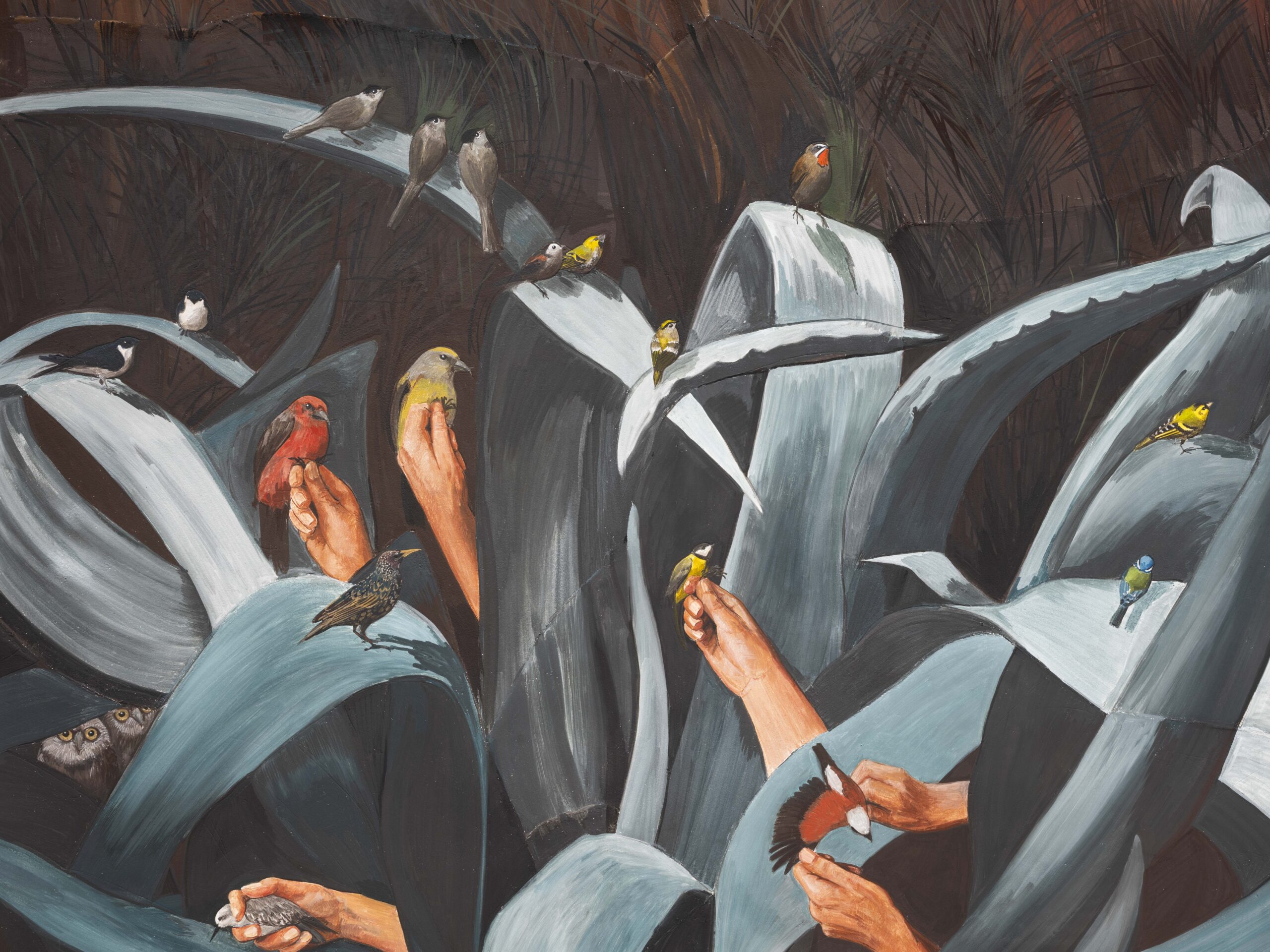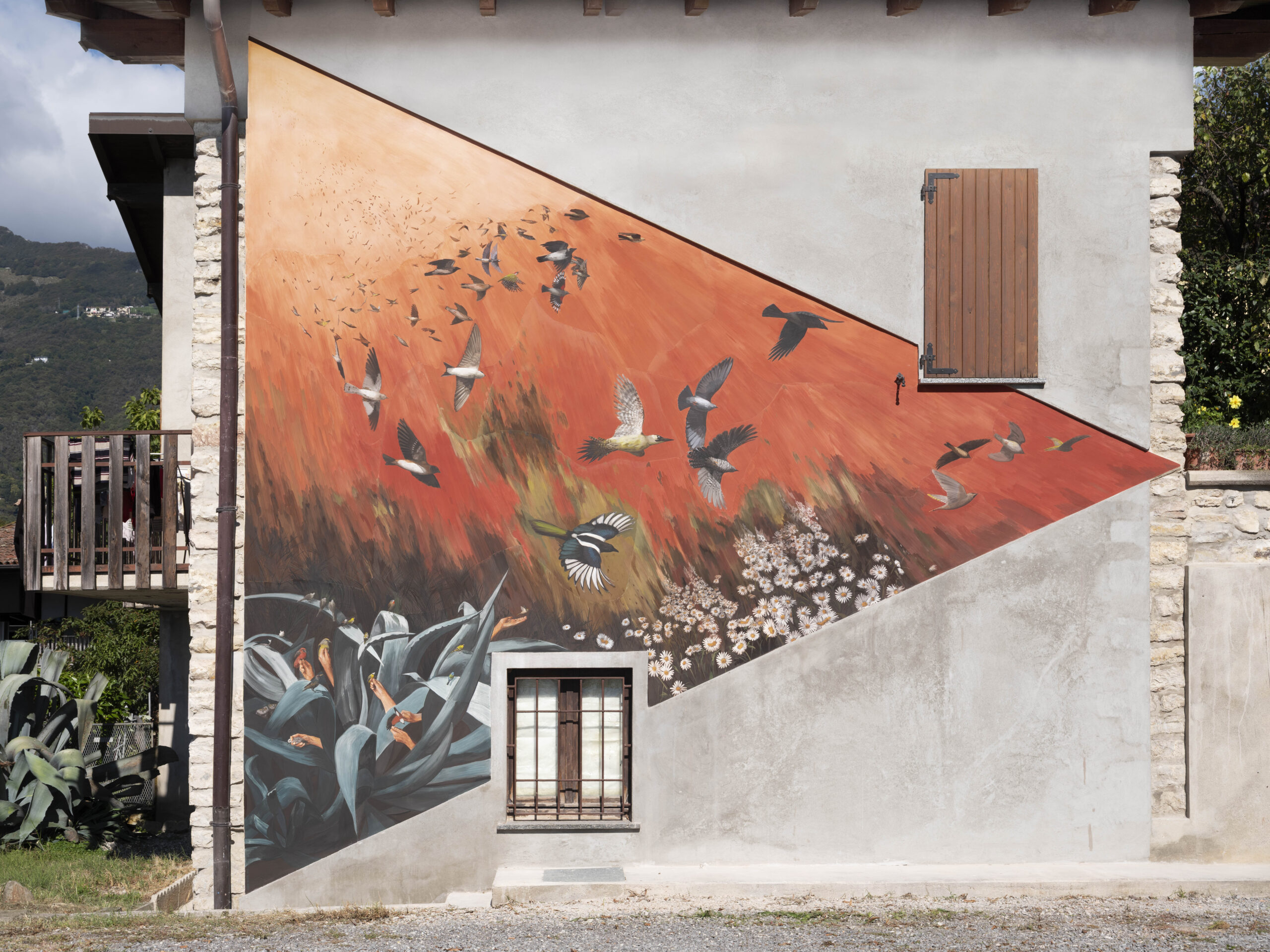 The fresco, created using traditional techniques, unfolds on a wall overlooking the town’s central square. Its triangular composition echoes the silhouette of Monte Albenza in the background, which seems to continue seamlessly into the painting itself. This shape becomes the foundation for a visual narrative in which a flock of birds—composed of dozens of different species—moves from the peaks down toward the plain, while others observe from below, hidden among the thick leaves of an agave plant. At the heart of the plant, hands emerge, forming gestures that suggest, on one hand, the precise scientific practice of bird ringing, and on the other, the intimate and everyday act of picking a flower. In this interplay of images, conjoined daisies—double flowers on a single stem—become a metaphor for the artist’s research: images of union and ambivalence, speaking of fragility and resilience, but also of seemingly irreconcilable forms of coexistence.