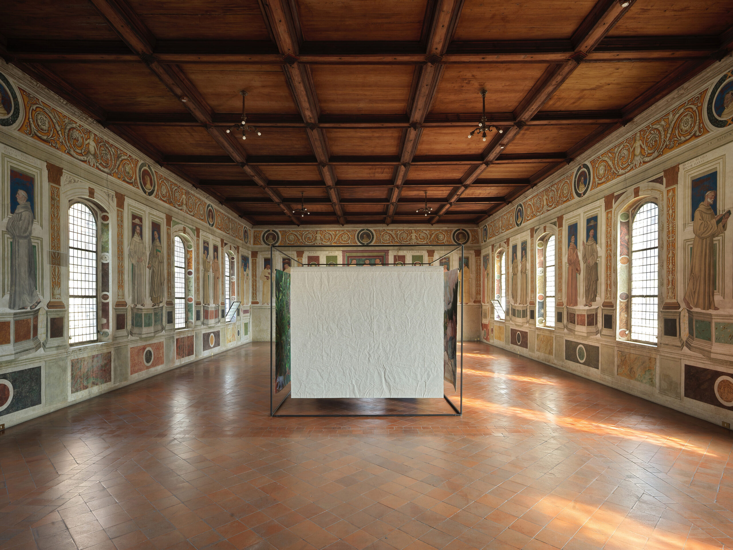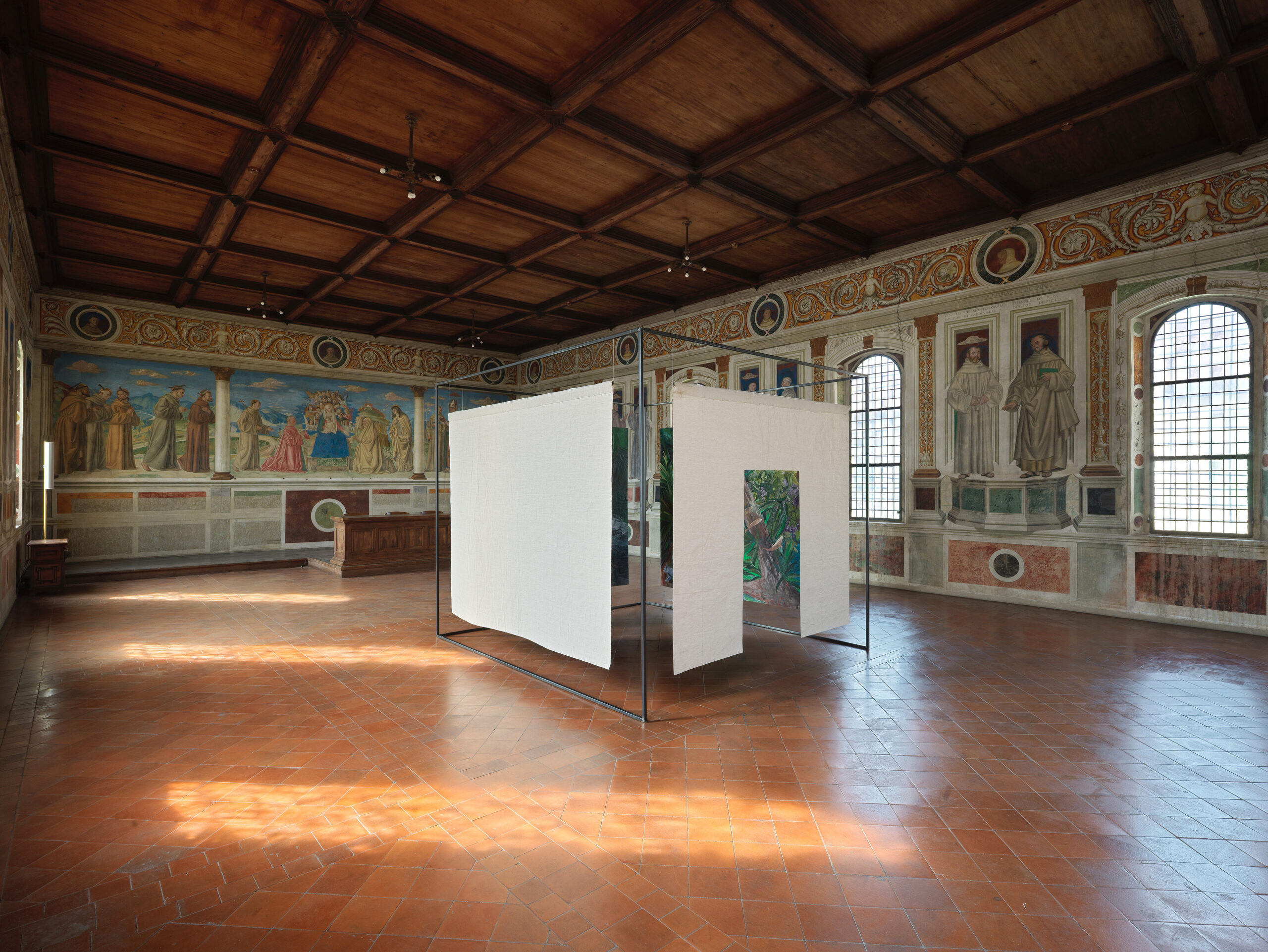 L’installazione ha l’aspetto di un habitat domestico nomade, una mise en abîme di uno spazio nello spazio, con “pareti” in lino anziché di calce, monocrome all’esterno e interrotte da un’invisibile soglia d’ingresso. I cartoni, sospesi e precari, mostrano i loro colori all’interno come muri dipinti di una dimora ideale, in contrapposizione all’eternità (presunta) garantita dal processo chimico che incorpora i pigmenti nell’intonaco steso “a giornate”. L’affresco, concepito per rimanere invariato per secoli, si misura in questo caso con la fragilità del proprio film pittorico nonché dell’ossatura su cui è fissato, e dunque con la sua potenziale scomparsa.
