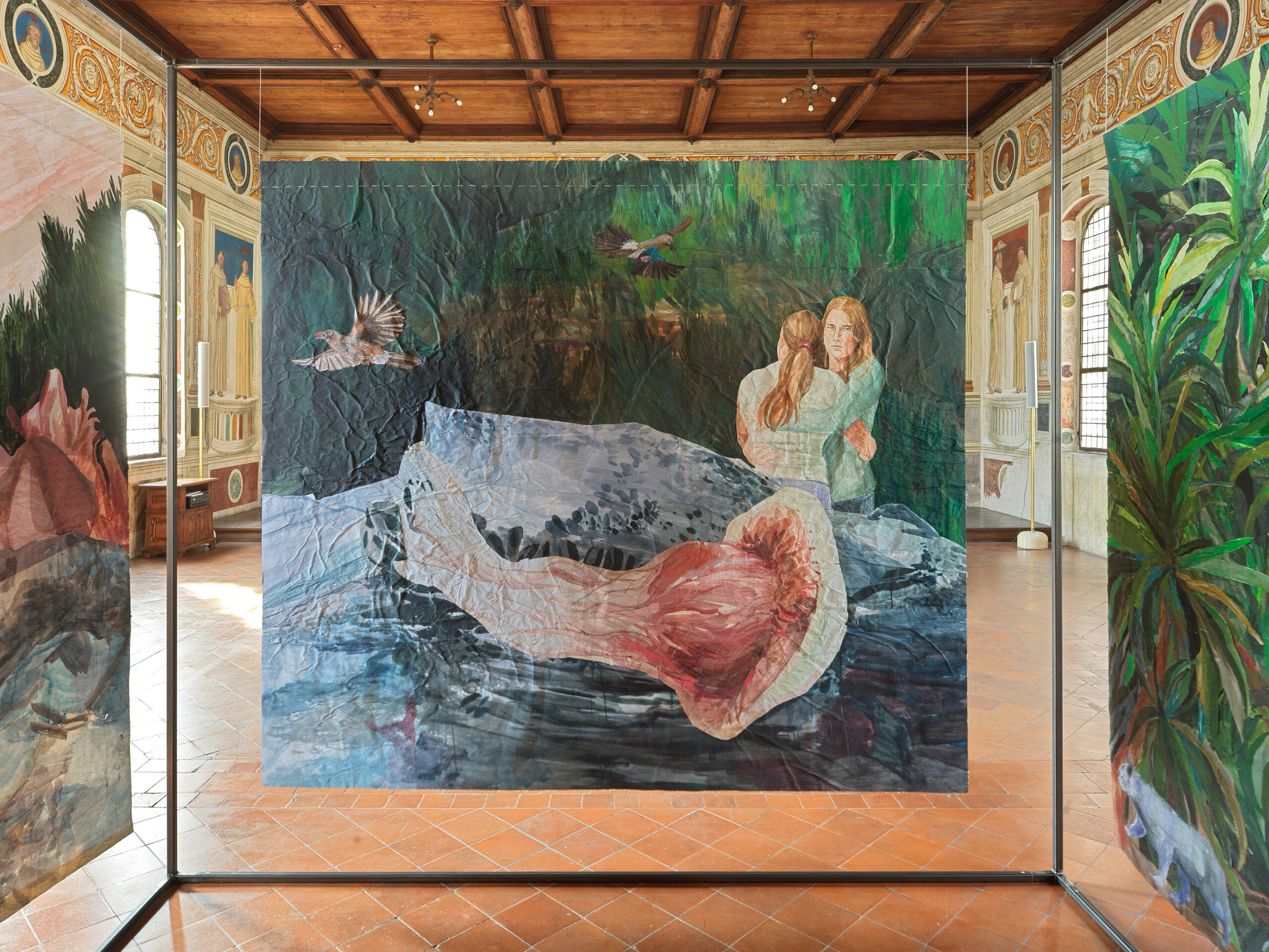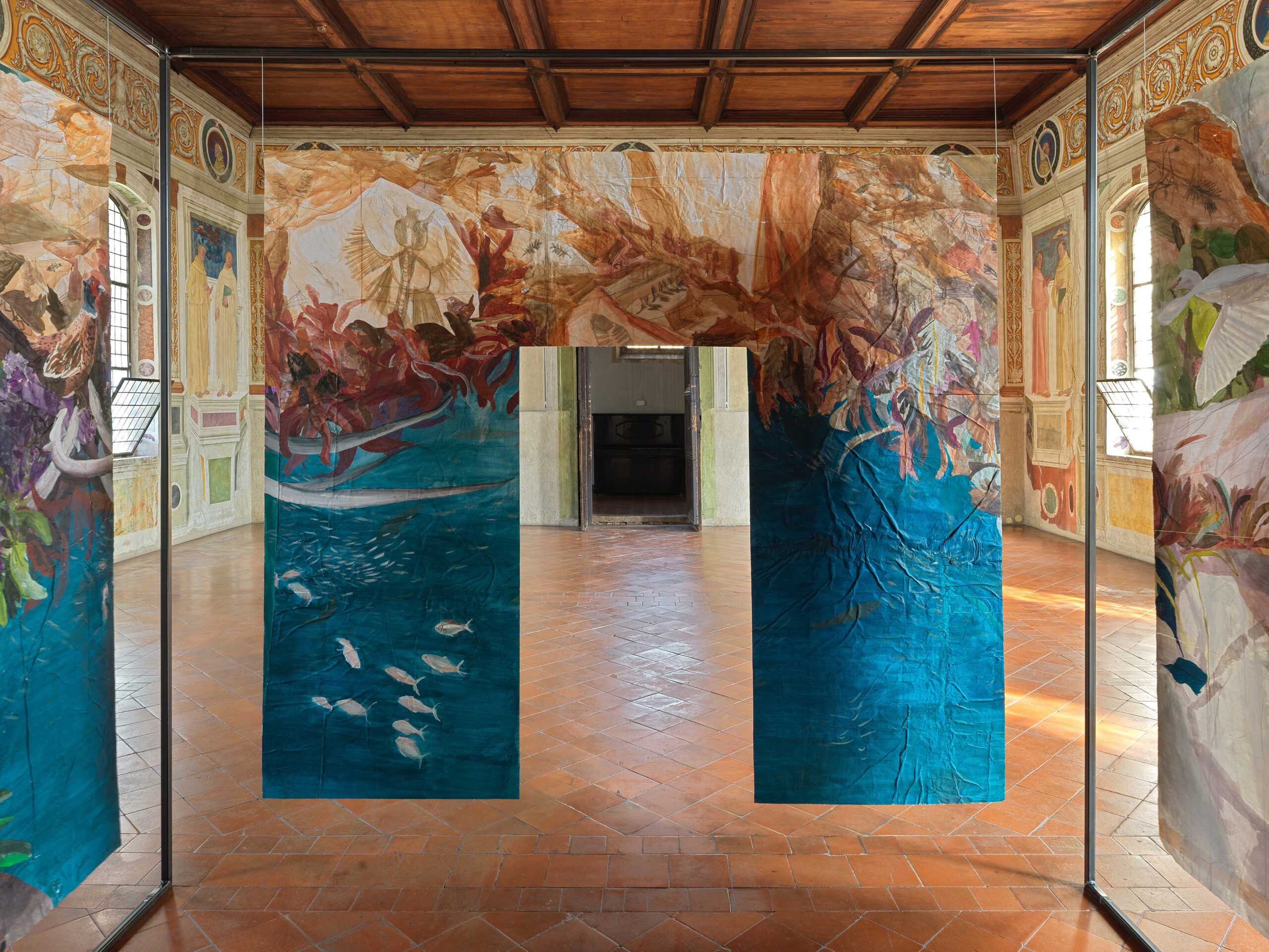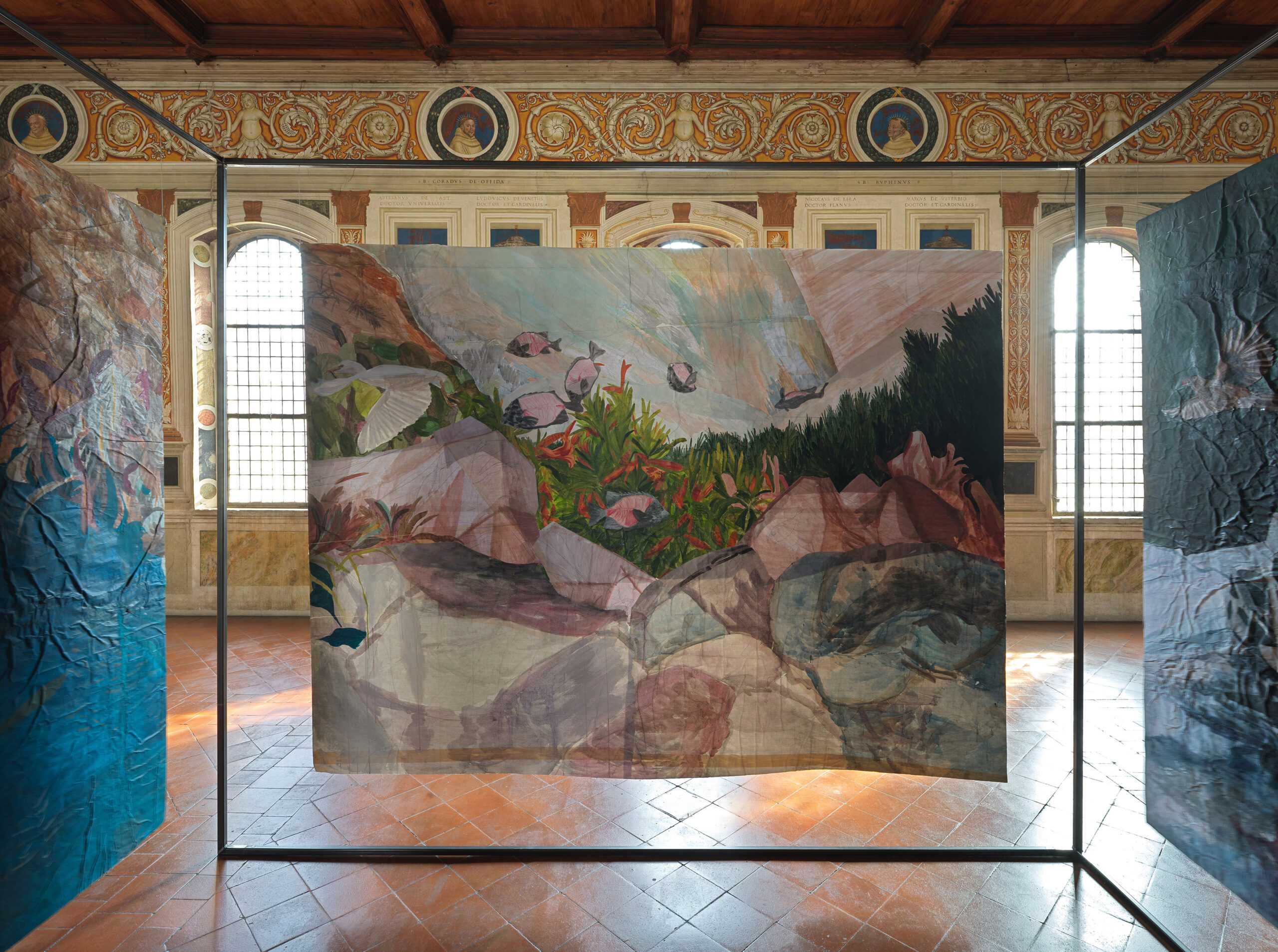 Con un salto epocale l’installazione riporta lo spettatore alle testimonianze pittoriche delle domus di Pompei, scoperte in etàborbonica, intorno al XVIII secolo. Nonostante non sia stato possibile per Domenico Morone o per il figlio Francesco ispirarsi alle pareti pompeiane, i santi e martiri della sala del Convento di San Bernardino a Verona presentano somiglianze con le proporzioni dello stile pittorico più maturo del primo secolo a.C.. La sala richiama alla memoria il cosiddetto “quarto stile” della nota Villa dei Misteri, in cui sono presenti figure femminili a grandezza naturale, anche se i santi del Morone poggiano su podi che ricordano i portici delle piazze di Giorgio De Chirico o su specchiature marmoree che somigliano a opere di Daniel Buren e Donald Judd ante litteram. D’altro canto, l’artista nata nel 1996 ha indubbiamente sedimentato nella propria memoria i colori delle domus pompeiane: basti pensare allo sfondo rosso del suo affresco La montagna non esiste presentato di recente ad Almenno San Bartolomeo, in provincia di Bergamo. Galiotto ha trovato interessanti parallelismi anche tra l’antica Pompei e la microscopica isola coreana di Gapado, nel Mar Giallo, durante i sei mesi trascorsi in residenza su invito di Yasmil Raymond, già curatrice di pittura del MoMA di New York. «A Gapado –ricorda l’artista– i tifoni e l’acqua salata disboscavano l’isola e distruggevano le costruzioni degli abitanti, proprio come il vulcano ha spazzato via la civiltà di Pompei. Solo nelle case abbandonate crescevano specie vegetali ad alto fusto, poiché al riparo dal vento e dal sale. Mentre sulla terraferma la vita sembrava morta, quella subacquea era rigogliosa». Novella Atlantide nella memoria di Agnese, Gapado è evocata a Verona grazie a creature marine come una gigantesca medusa rosa, sospesa su quei muri di tela che ricostruiscono in Sala Morone un’immaginaria struttura “cellulare”, tipica delle case coreane, con una stanza centrale e altri ambienti ai lati.