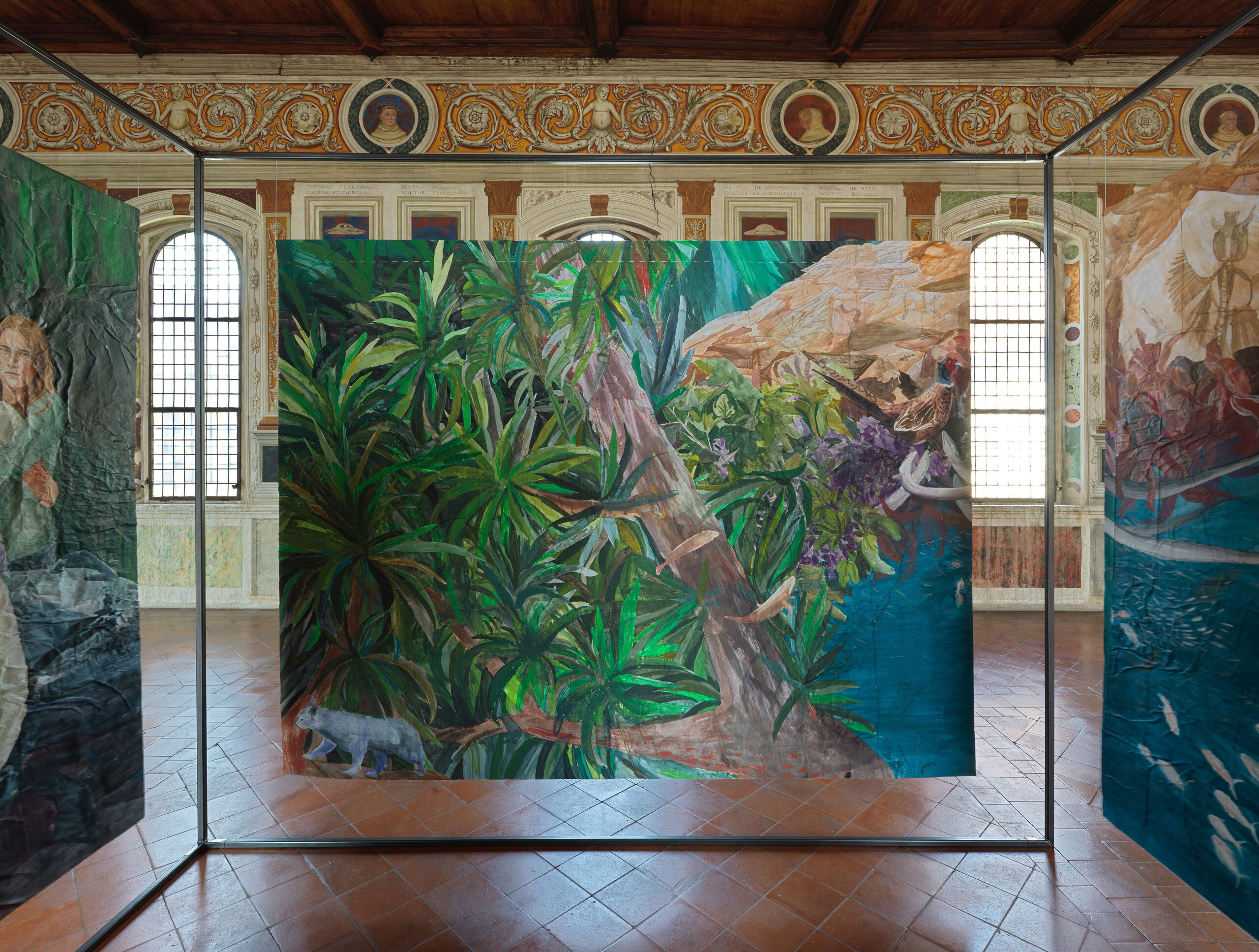 The installation “Scheletro” (Skeleton) is presented as a quadrangular iron structure that is also a habitable space: rooms boxed into each other delineate geometries that protect and isolate their respective contents, keeping them enclosed within their architectural structure. Once inside, we are immersed in a collage composed of the preparatory cartons of frescoes used as a 1:1 scale reference to paint walls of abandoned houses, exhibition spaces, corridors. The walls are transformed into forests, fossil expanses and floating abysses.